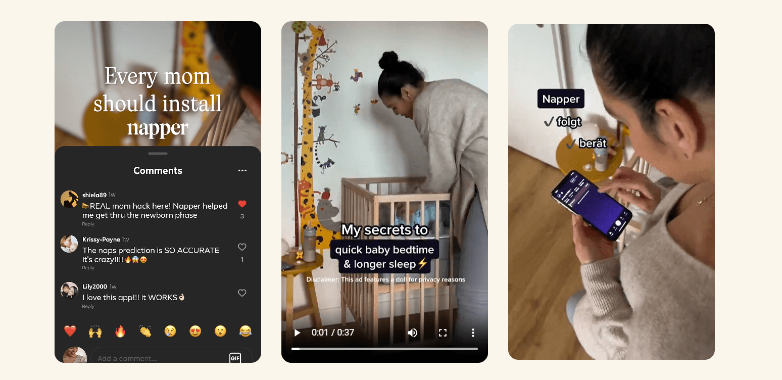 We did this for Napper, an app for navigating baby sleep patterns. With studio-quality UGC-based creatives, we highlighted the issue faced by new moms and how the app provides the solution.